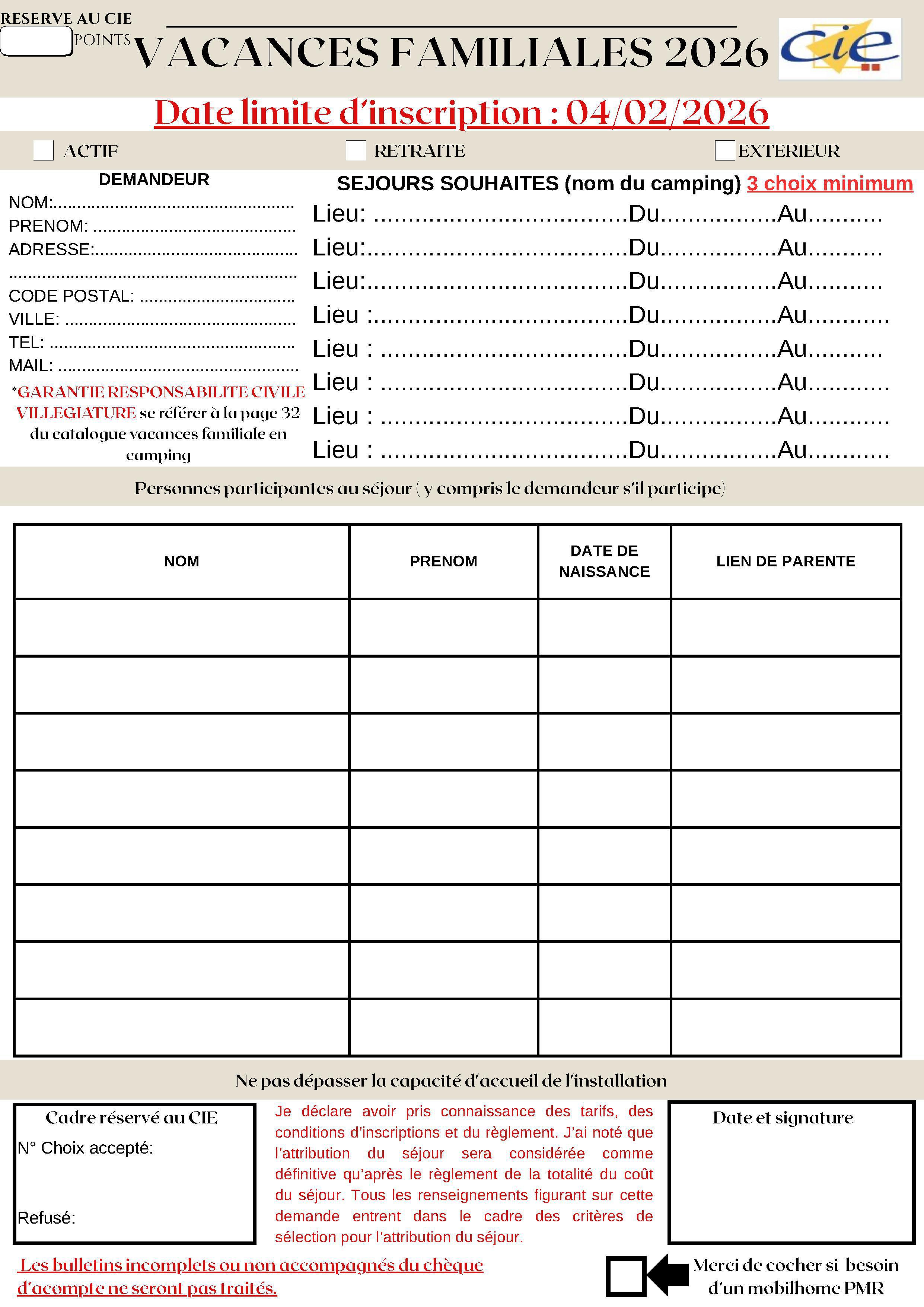 Vous trouverez, ci-après, le catalogue des destinations proposées par votre CIE ainsi que le bulletin d’inscription à nous retourner complété.
